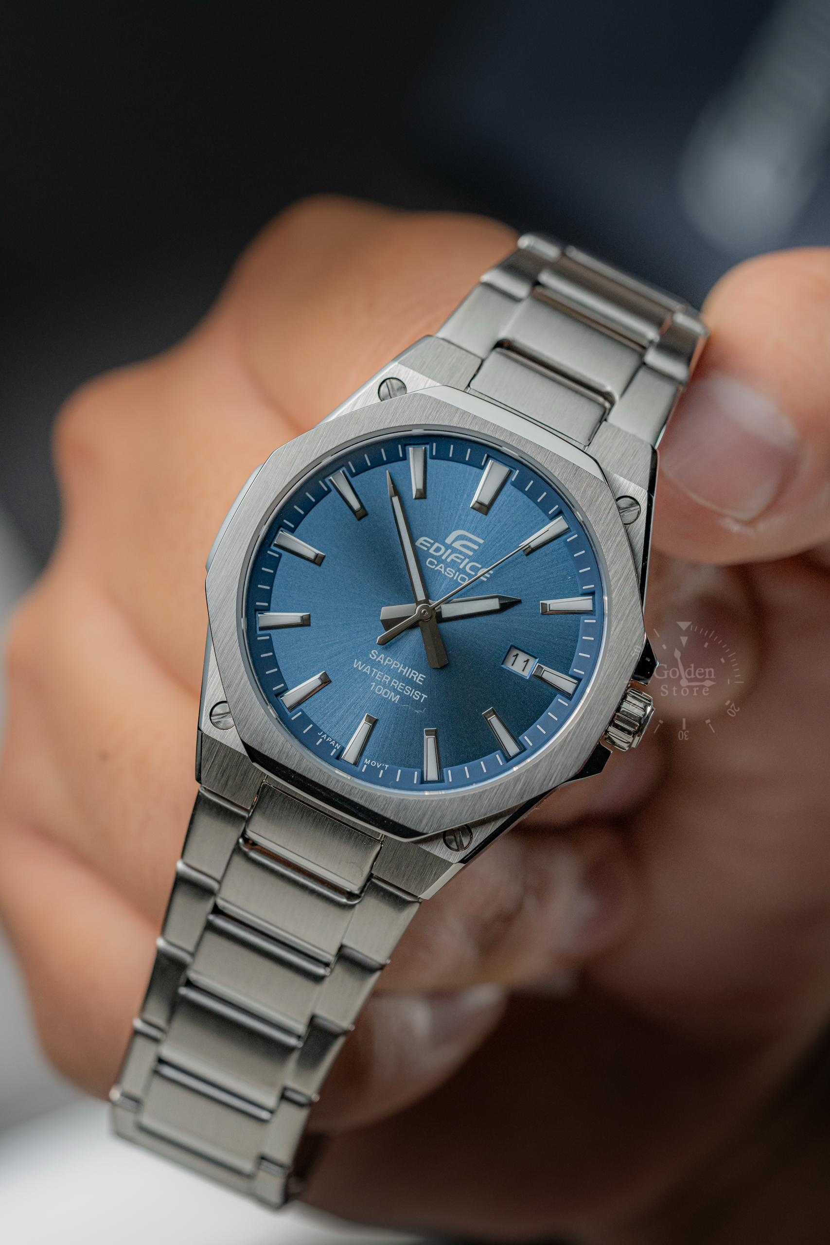 Serie EDIFICE SLIM con cristal de zafiro | Un cronógrafo delgado y deportivo de la serie EFR-S572. Aunque las carcasas cronográficas de varias manecillas tienden a ser gruesas, la carcasa de este modelo se mantuvo a un grosor de 9,1 mm para garantizar un buen ajuste. El marco está diseñado para verse como un rotor de frenos de automóvil con hendiduras. Dispone de un cristal de zafiro resistente a los rayones.