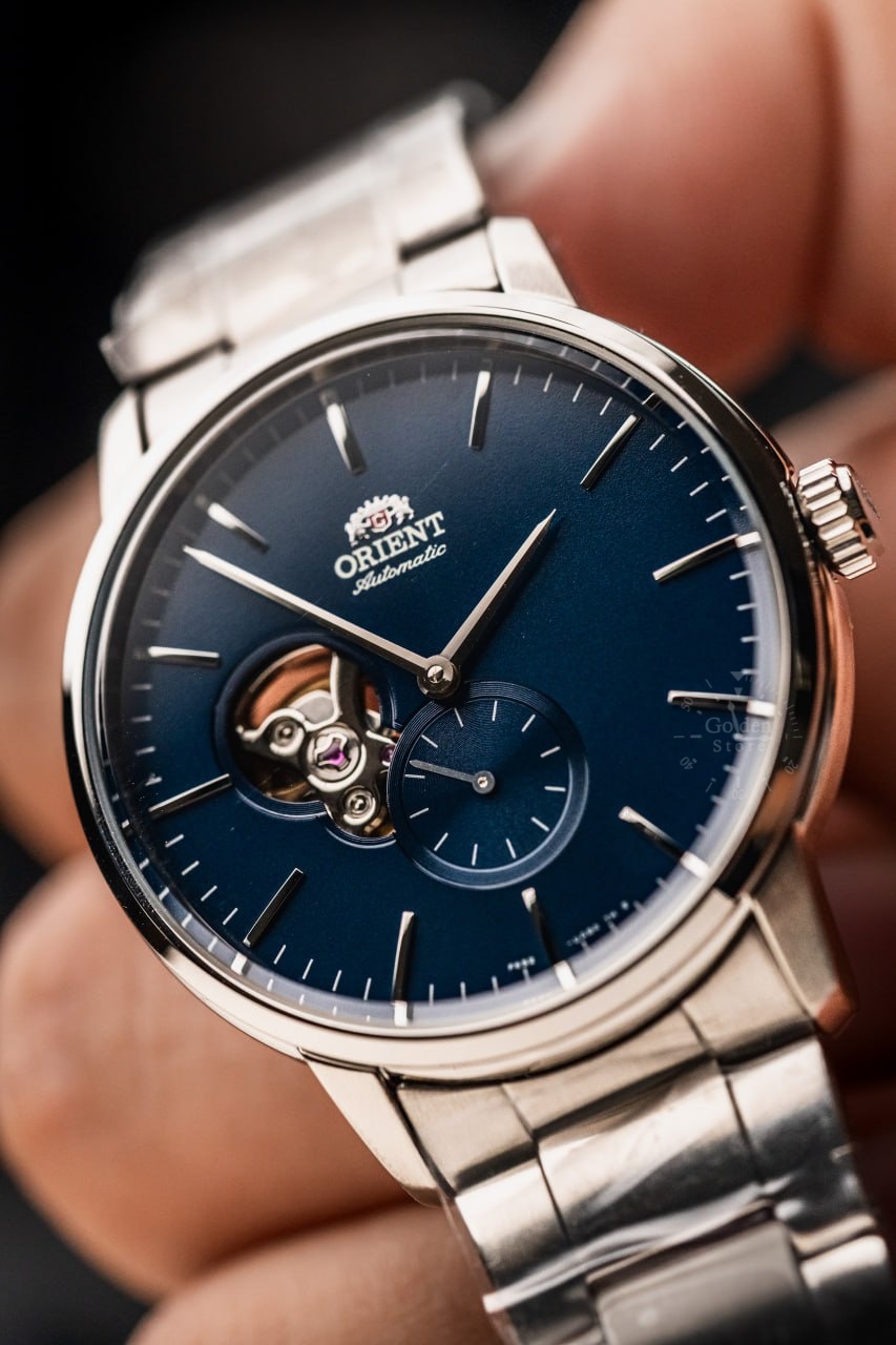 El Orient RA-AR0101L Open Heart pertenece a la línea Contemporary y destaca por su diseño moderno con ventana semi-skeleton y segundero pequeño. Su nuevo calibre F6S22 equilibra perfectamente los elementos del dial: apertura a las 9, pequeño segundero a las 6 y el emblema Orient con el león a las 12. Su esfera azul, manecillas plateadas y construcción robusta lo convierten en una pieza sofisticada, precisa y ideal para quienes buscan estilo y desempeño.