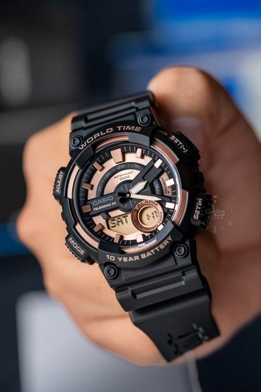 El Casio AEQ-110W-1A3V es un reloj deportivo diseñado para durar, con una batería de 10 años, resistencia al agua de 100 m y funciones prácticas para el uso diario. Su diseño robusto en resina, pantalla combinada analógica-digital y memoria Telememo lo hacen ideal para quienes buscan utilidad y resistencia.