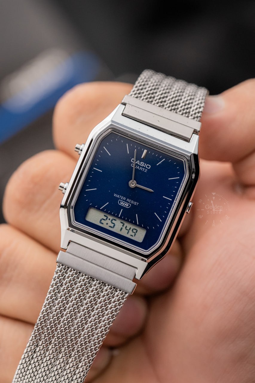 El Casio AQ-230EM-2A es la combinación perfecta entre estilo retro y elegancia moderna. Su diseño analógico-digital con pulso de malla de acero inoxidable le da un acabado sofisticado, ideal para quienes buscan un reloj versátil que se adapte tanto a looks formales como casuales.