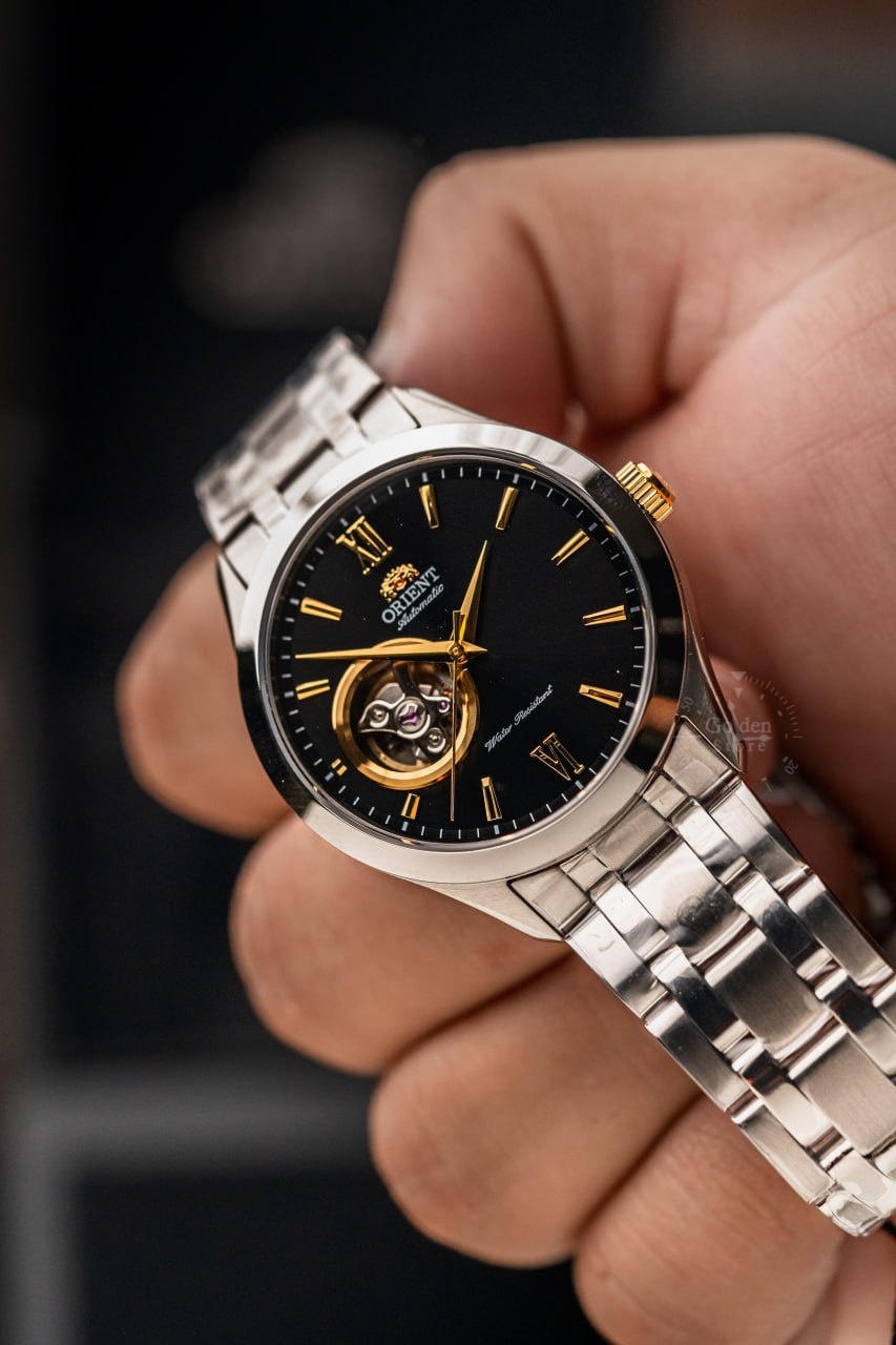 El Orient TAG03002B destaca por su diseño contemporáneo con una elegante esfera negra realzada por agujas y marcadores dorados, creando un contraste sofisticado y moderno. Su construcción en acero inoxidable y su detalle de vista parcial del mecanismo lo convierten en una pieza ideal para quienes buscan estilo y precisión en un solo reloj.