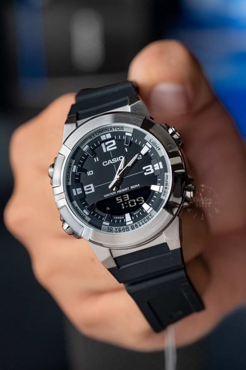 Reloj robusto con diseño funcional, combinación de caja de acero y correa de resina, ideal para uso diario y actividades deportivas.