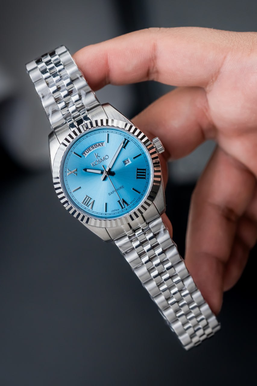 El Kosmo 5835-7- combina elegancia moderna con materiales premium, destacando su distintiva esfera azul claro y estructura completamente en acero inoxidable.