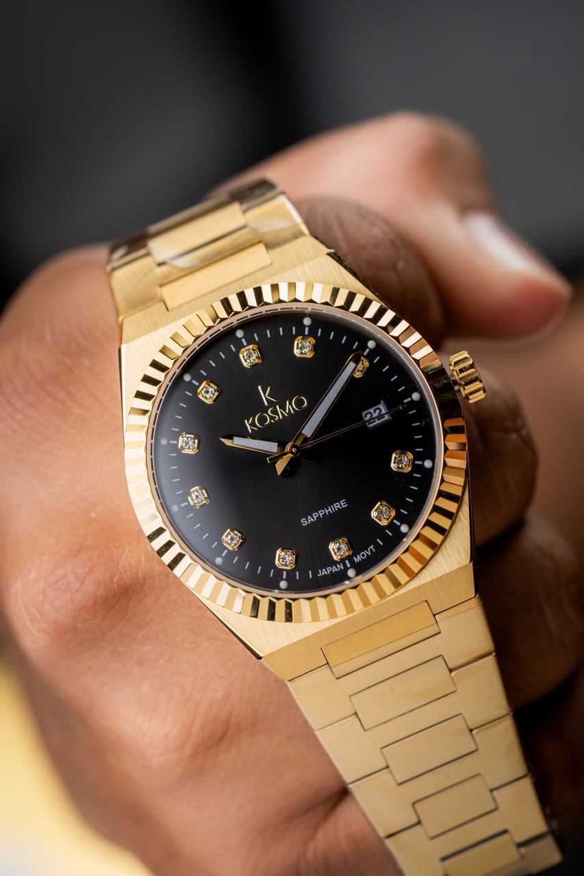 Elegancia atemporal en cada detalle. Este reloj Kosmo combina una caja dorada de acero inoxidable 316L con una esfera negra de acabado sunray. Su cristal zafiro y movimiento japonés aseguran durabilidad y precisión, ideal para quienes buscan distinción en su muñeca.